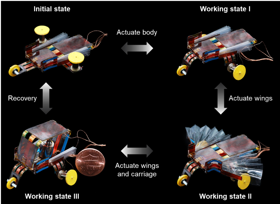 Serving as “morphable exoskeletons”, the actuators can be integrated with functional components like sensors and motors to build complex robotic systems. The research team developed a multifunctional wheeled microrobot that can morph into “sports car”“winged car” and “van” modes.