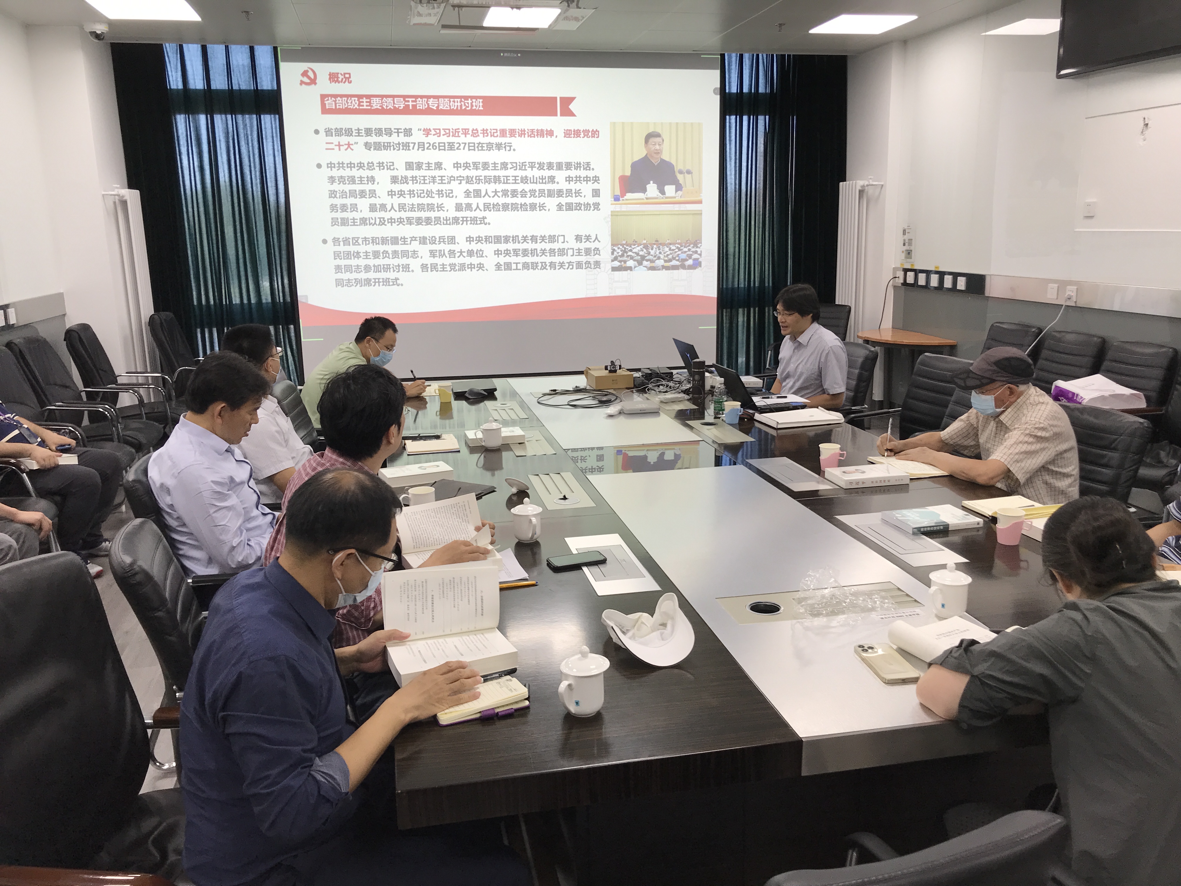 参会人员首先观看了视频介绍,院党委副书记黄伟希从谱写全面建设社会主义现代化国家崭新篇章,党的二十大召开的重大意义,科学分析当前国际国内形势,党的十九大以来的工作成绩,新时代十年的伟大变革,阐释新时代坚持和发展中国特色社会主义的重大理论和实践问题,阐明未来一个时期党和国家事业发展的大政方针和行动纲领,在广大知识分子和青年学生中引发热烈反响等方面带领与会人员学习了习近平总书记在省部级主要领导干部“学习习近平总书记重要讲话精神,迎接党的二十大”专题研讨班上的重要讲话。之后,黄伟希介绍了更好把握和运用党的百年奋斗历史经验,推进马克思主义中国化时代化,正确把握社会主要矛盾和中心任务,重视战略策略问题,永葆党的马克思主义政党本色,推进党史学习教育常态化长效化等习近平总书记在省部级主要领导干部学习贯彻党的十九届六中全会精神专题研讨班开班式上的重要讲话内容。黄伟希还对党的十九届六中全会进行了简短回顾,介绍了即将召开的党的二十大相关内容。