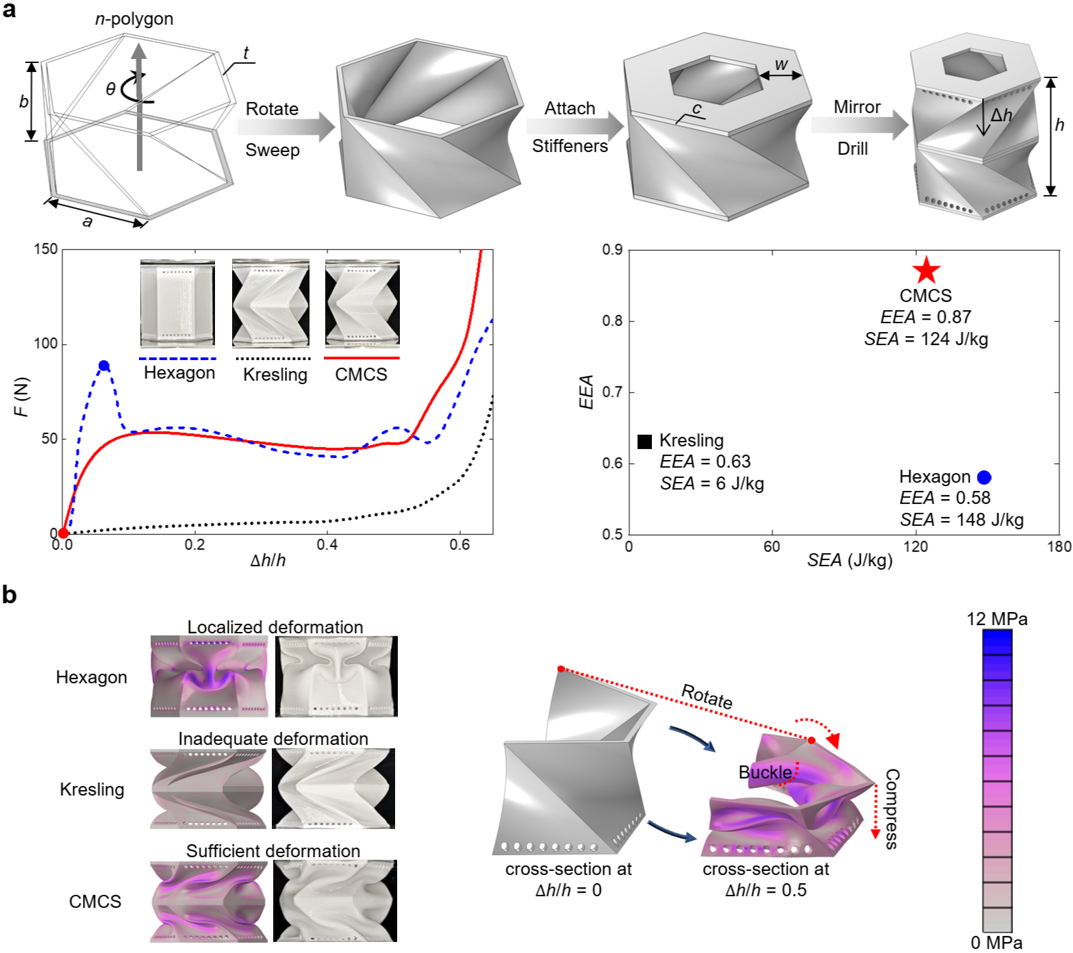 柳占立课题组与合作者提出了一种手性多曲壳(Chiral Multi-Curved Shell,CMCS)超材料,通过压扭与屈曲机理的协同耦合,实现了“高承载力-平滑吸能曲线”的统一,并在此基础上兼具较高的吸能效率和比吸能(图1a)。通过独特的压缩-旋转-屈曲变形模式,应力得以在结构的大部分区域内分布,充分发挥了材料性能,同时有利于避免因应力过度集中而导致的局部过载与失效(图1b)。